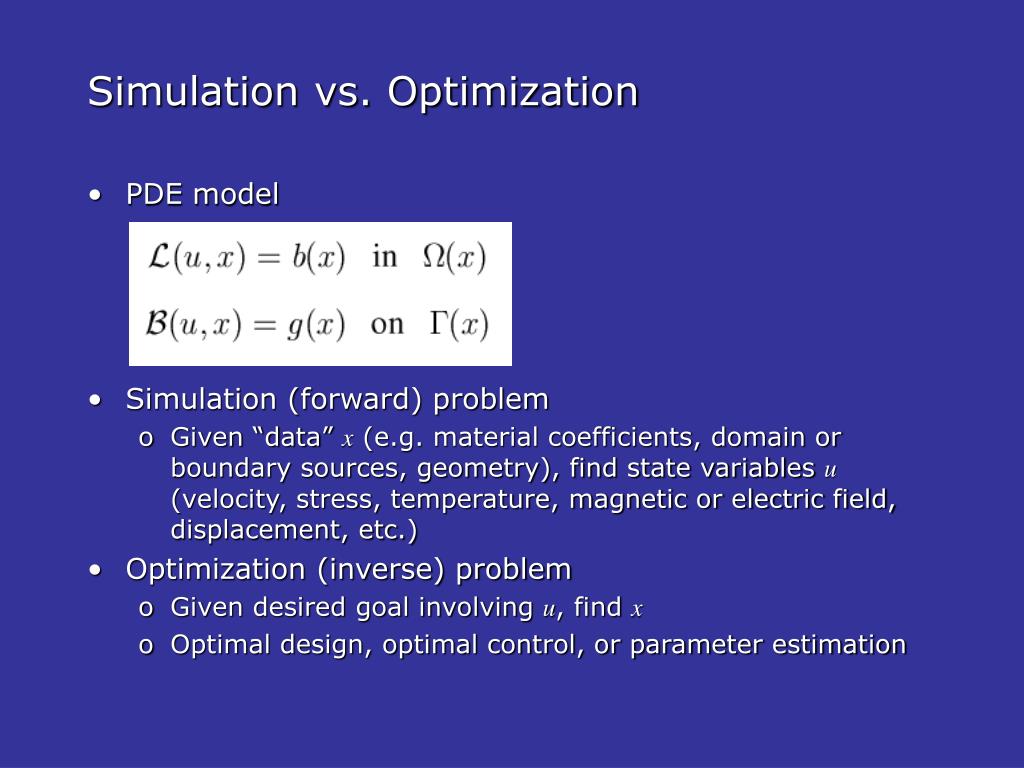 Simulation vs. Optimization • PDE model • Simulation (forward) problem • Given “data” x (e.g. material coefficients, domain or boundary sources, geometry), find state variables u (velocity, stress, temperature, magnetic or electric field, displacement, etc.) • Optimization (inverse) problem • Given desired goal involving u, find x • Optimal design, optimal control, or parameter estimation