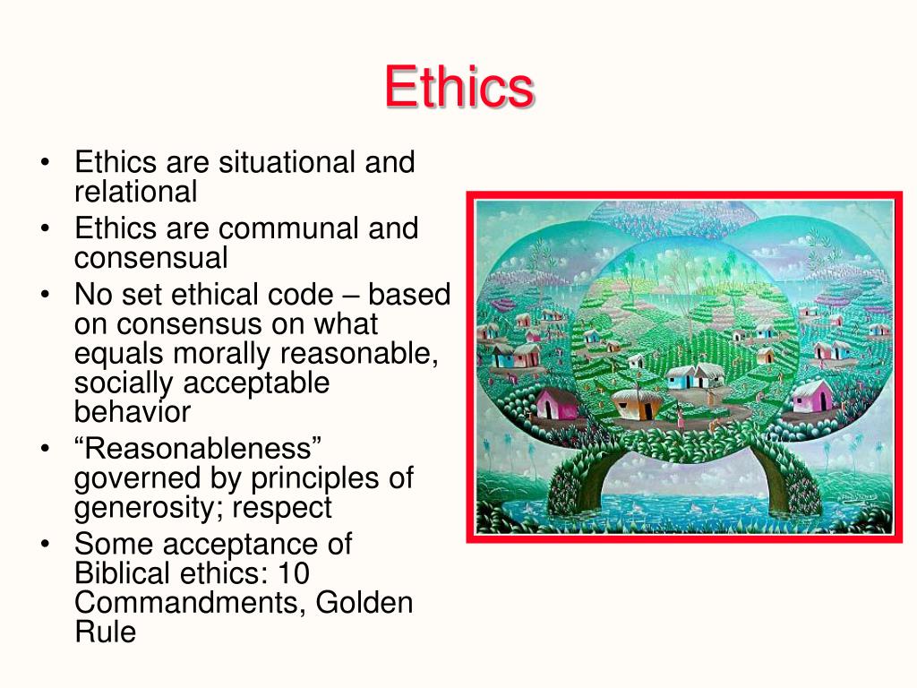 Ethics • Ethics are situational and relational • Ethics are communal and consensual • No set ethical code – based on consensus on what equals morally reasonable, socially acceptable behavior • “Reasonableness” governed by principles of generosity; respect • Some acceptance of Biblical ethics: 10 Commandments, Golden Rule
