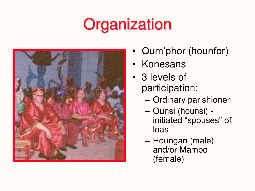 Organization • Oum’phor (hounfor) • Konesans • 3 levels of participation: • Ordinary parishioner • Ounsi (hounsi) - initiated “spouses” of loas • Houngan (male) and/or Mambo (female)