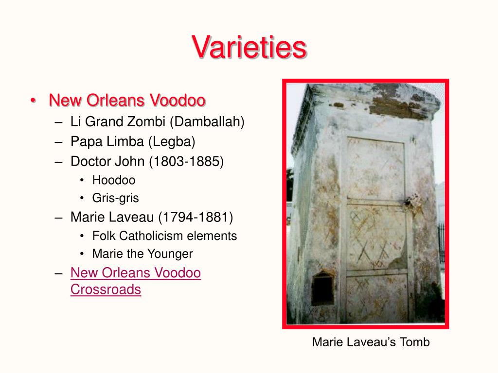 Varieties • New Orleans Voodoo • Li Grand Zombi (Damballah) • Papa Limba (Legba) • Doctor John (1803-1885) • Hoodoo • Gris-gris • Marie Laveau (1794-1881) • Folk Catholicism elements • Marie the Younger • New Orleans Voodoo Crossroads Marie Laveau’s Tomb