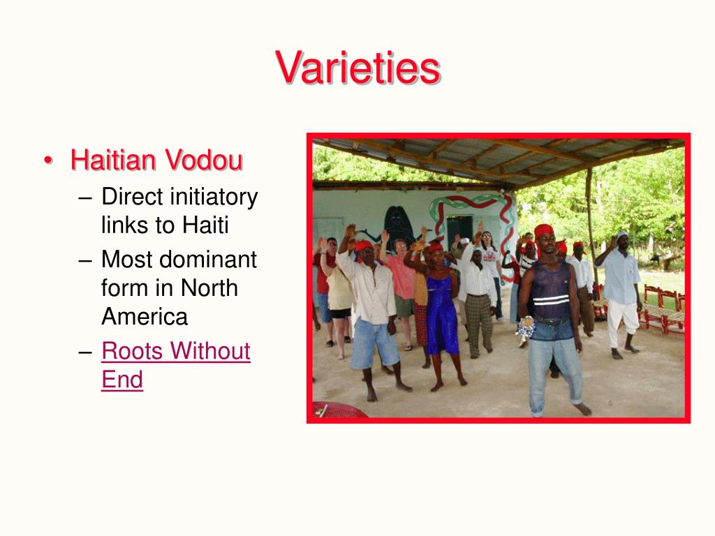 Varieties • Haitian Vodou • Direct initiatory links to Haiti • Most dominant form in North America • Roots Without End