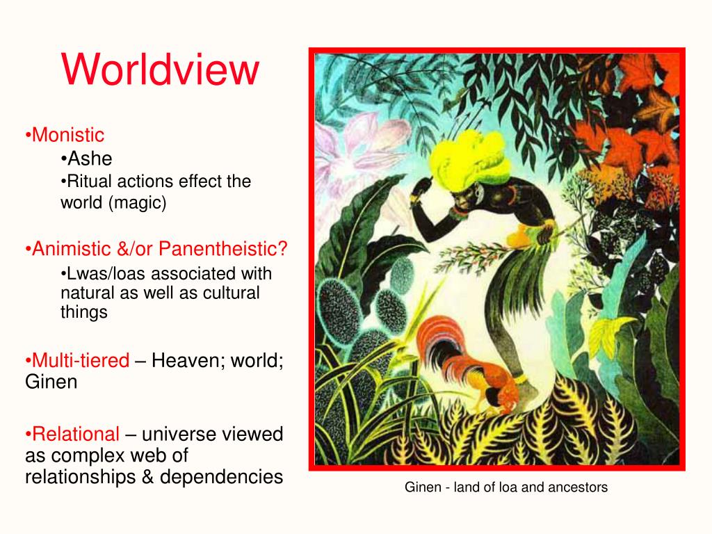 Worldview • Monistic • Ashe • Ritual actions effect the world (magic) • Animistic &/or Panentheistic? • Lwas/loas associated with natural as well as cultural things • Multi-tiered – Heaven; world; Ginen • Relational – universe viewed as complex web of relationships & dependencies Ginen - land of loa and ancestors