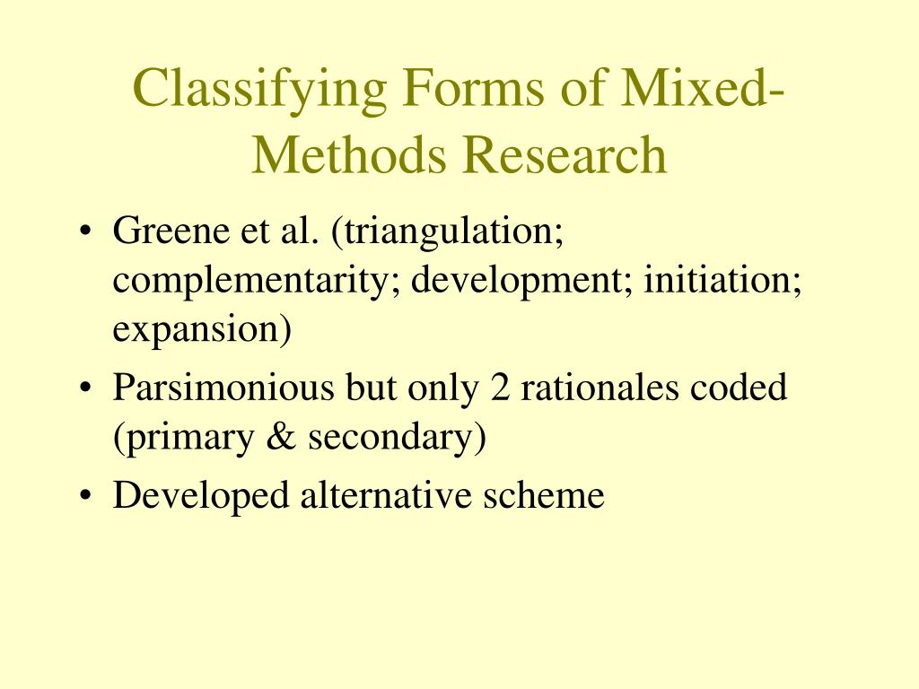 Classifying Forms of Mixed-Methods Research • Greene et al. (triangulation; complementarity; development; initiation; expansion) • Parsimonious but only 2 rationales coded (primary & secondary) • Developed alternative scheme