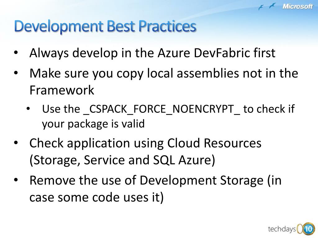 Always develop in the Azure DevFabric first Make sure you copy local assemblies not in the Framework Use the _CSPACK_FORCE_NOENCRYPT_ to check if your package is valid Check application using Cloud Resources (Storage, Service and SQL Azure) Remove the use of Development Storage (in case some code uses it) Development Best Practices