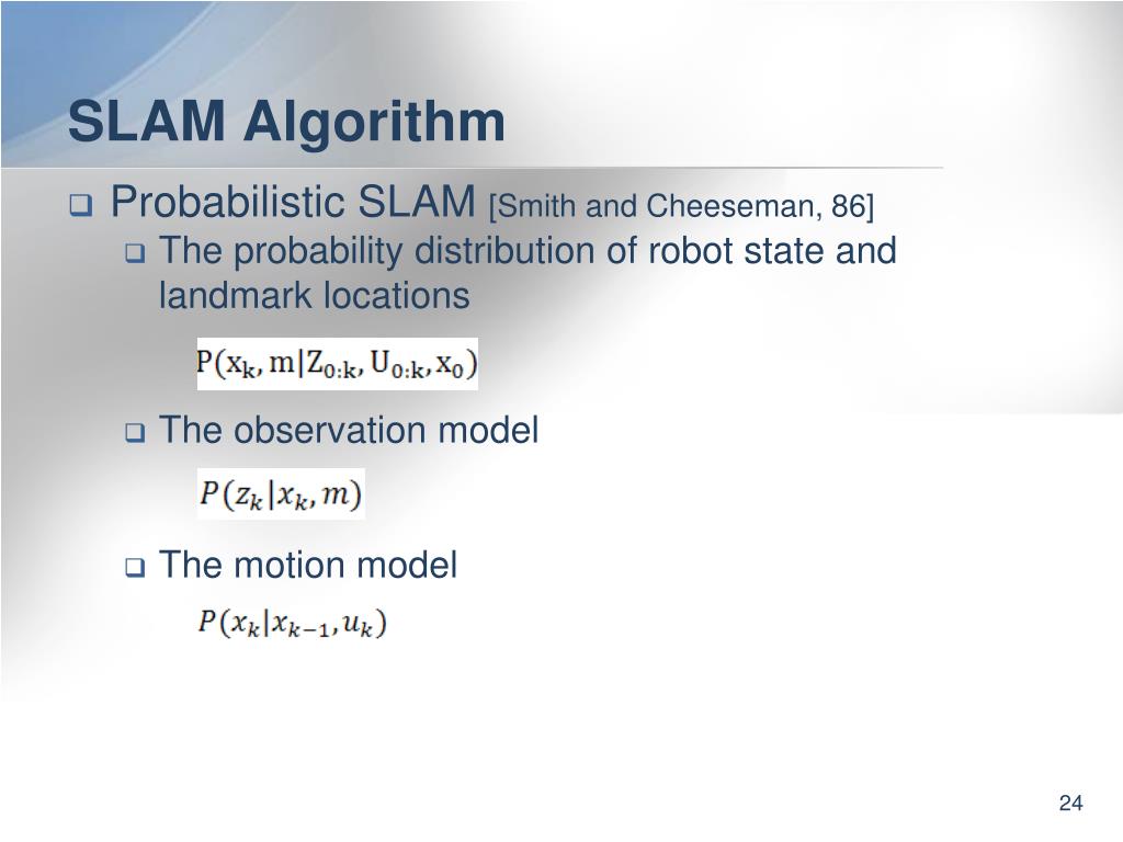 SLAM Algorithm • Probabilistic SLAM [Smith and Cheeseman, 86] • The probability distribution of robot state and landmark locations • The observation model • The motion model