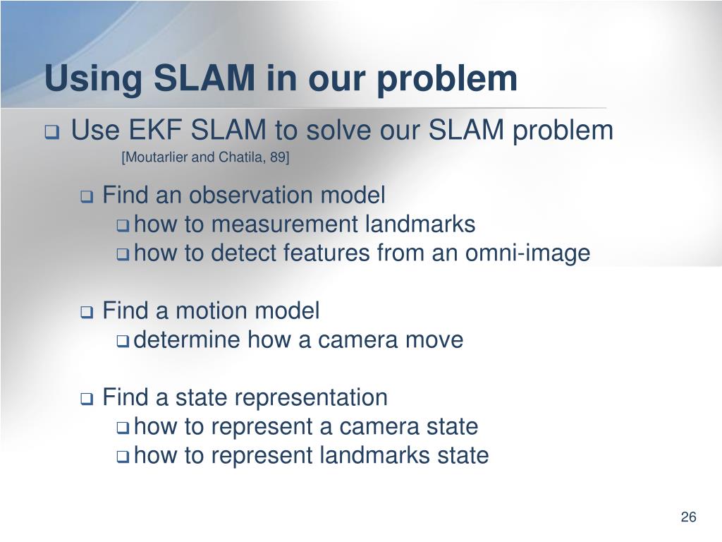 Using SLAM in our problem • Use EKF SLAM to solve our SLAM problem • Find an observation model • how to measurement landmarks • how to detect features from an omni-image • Find a motion model • determine how a camera move • Find a state representation • how to represent a camera state • how to represent landmarks state [Moutarlier and Chatila, 89]