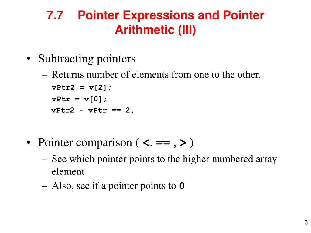 7.7 Pointer Expressions and Pointer Arithmetic (III) • Subtracting pointers • Returns number of elements from one to the other. vPtr2 = v[2]; vPtr = v[0]; vPtr2 - vPtr == 2. • Pointer comparison ( <, == , > ) • See which pointer points to the higher numbered array element • Also, see if a pointer points to 0