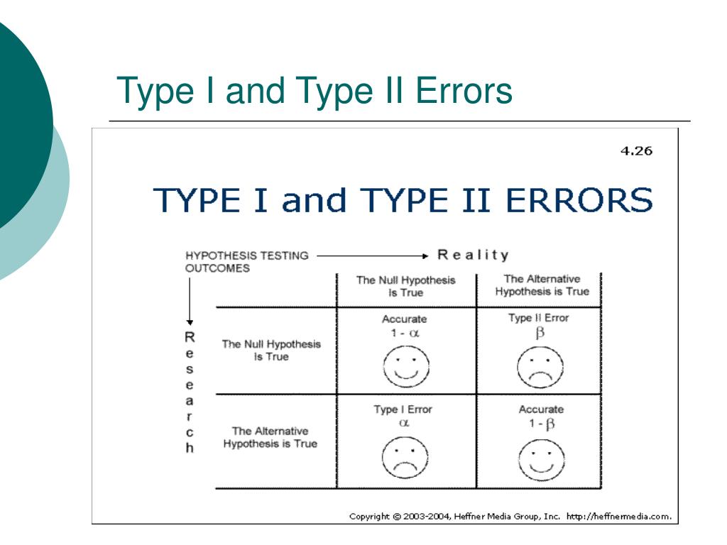 Things to Remember: • A Type I error can occur only when a null hypothesis is true. You incorrectly reject a TRUE null hypothesis. • A Type II error can only occur when a null hypothesis is false. You incorrectly accept a FALSE null hypothesis. • The Power of a Test is 1 - probability (Type II error). This is the probability that you correctly reject a false null hypothesis. • One needs an alternative to the null hypothesis in order to calculate a Type II error. Without an alternative hypothesis, the question “What is the probability of a Type II error?” is meaningless.