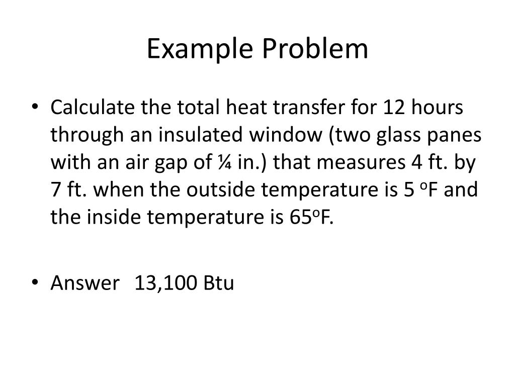 Example Problem • Calculate the total heat transfer for 12 hours through an insulated window (two glass panes with an air gap of ¼ in.) that measures 4 ft. by 7 ft. when the outside temperature is 5 oF and the inside temperature is 65oF. • Answer 13,100 Btu
