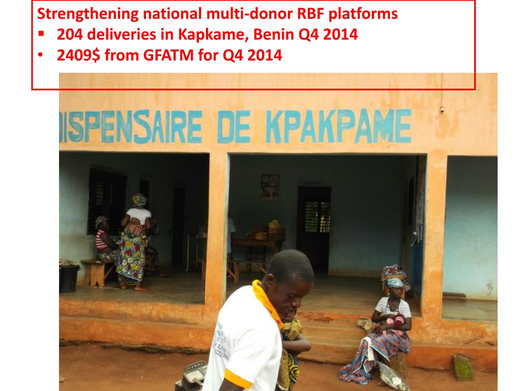 Strengthening national multi-donor RBF platforms • 204 deliveries in Kapkame, Benin Q4 2014 • 2409$ from GFATM for Q4 2014