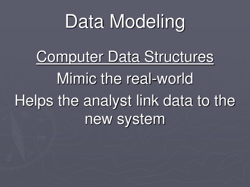 Data Modeling Computer Data Structures Mimic the real-world Helps the analyst link data to the new system
