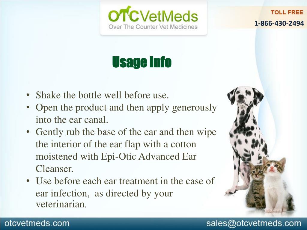 Usage Info • Shake the bottle well before use. • Open the product and then apply generously into the ear canal. • Gently rub the base of the ear and then wipe the interior of the ear flap with a cotton moistened with Epi-Otic Advanced Ear Cleanser. • Use before each ear treatment in the case of ear infection, as directed by your veterinarian.