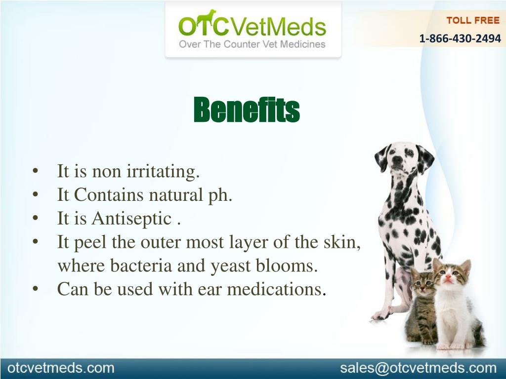 Benefits • It is non irritating. • It Contains natural ph. • It is Antiseptic . • It peel the outer most layer of the skin, where bacteria and yeast blooms. • Can be used with ear medications.