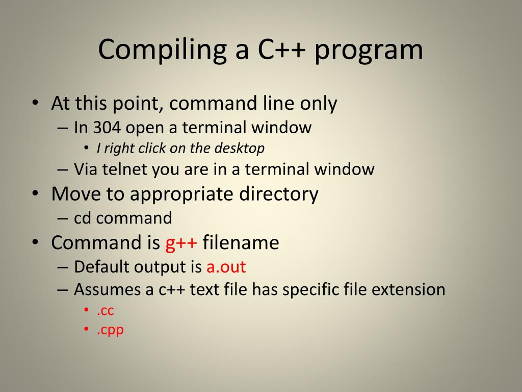 Compiling a C++ program • At this point, command line only • In 304 open a terminal window • I right click on the desktop • Via telnet you are in a terminal window • Move to appropriate directory • cd command • Command is g++ filename • Default output is a.out • Assumes a c++ text file has specific file extension • .cc • .cpp