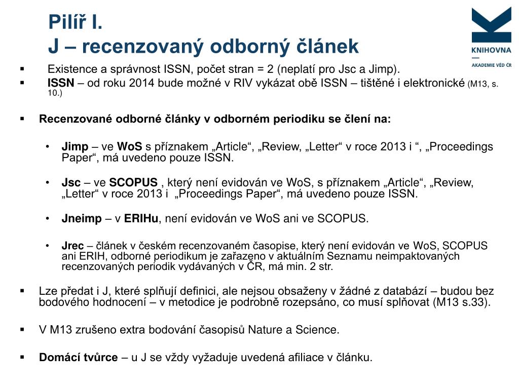 Pilíř I. J – recenzovaný odborný článek • Existence a správnost ISSN, počet stran = 2 (neplatí pro Jsc a Jimp). • ISSN – od roku 2014 bude možné v RIV vykázat obě ISSN – tištěné i elektronické(M13, s. 10.) • Recenzované odborné články v odborném periodiku se člení na: • Jimp – ve WoSs příznakem „Article“, „Review, „Letter“ v roce 2013 i “, „Proceedings Paper“, má uvedeno pouze ISSN. • Jsc – ve SCOPUS , který není evidován ve WoS, s příznakem „Article“, „Review, „Letter“ v roce 2013 i „Proceedings Paper“, má uvedeno pouze ISSN. • Jneimp – v ERIHu, není evidován ve WoS ani ve SCOPUS. • Jrec – článek v českém recenzovaném časopise, který není evidován ve WoS, SCOPUS ani ERIH, odborné periodikum je zařazeno v aktuálním Seznamu neimpaktovaných recenzovaných periodik vydávaných v ČR, má min. 2 str. • Lze předat i J, které splňují definici, ale nejsou obsaženy v žádné z databází – budou bez bodového hodnocení – v metodice je podrobně rozepsáno, co musí splňovat (M13 s.33). • V M13 zrušeno extra bodování časopisů Nature a Science. • Domácí tvůrce – u J se vždy vyžaduje uvedená afiliace v článku.