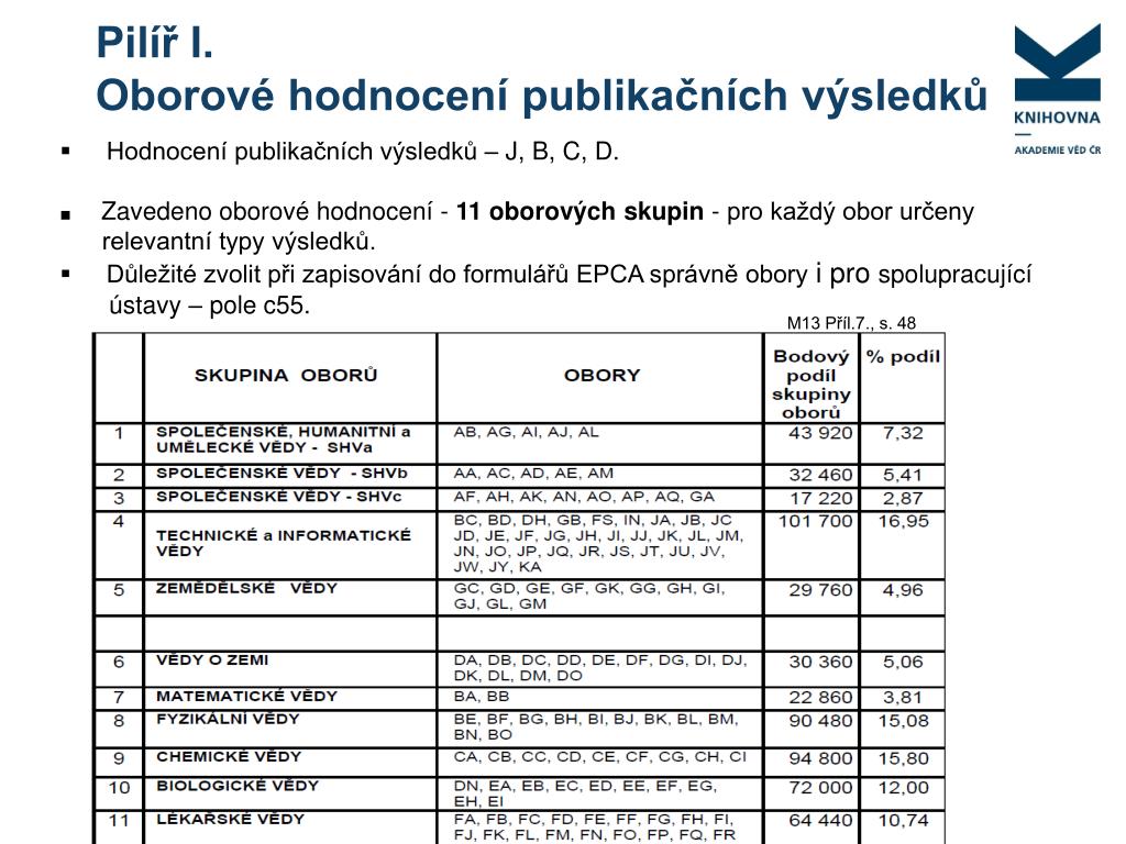 Pilíř I. Oborové hodnocení publikačních výsledků • Hodnocení publikačních výsledků – J, B, C, D. ■ Zavedeno oborové hodnocení - 11 oborových skupin - pro každý obor určeny • relevantní typy výsledků. • Důležité zvolit při zapisování do formulářů EPCA správně obory i pro spolupracující • ústavy – pole c55. M13 Příl.7., s. 48