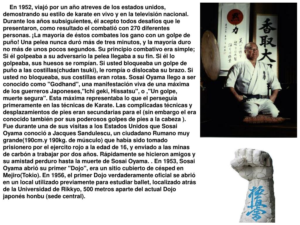 En 1952, viajó por un año atreves de los estados unidos, demostrando su estilo de karate en vivo y en la televisión nacional. Durante los años subsiguientes, él acepto todos desafíos que le presentaron, como resultado el combatió con 270 diferentes personas. ¡La mayoría de éstos combates los gano con un golpe de puño! Una pelea nunca duró más de tres minutos, y la mayoría duro no más de unos pocos segundos. Su principio combativo era simple; Si él golpeaba a su adversario la pelea llegaba a su fin. Si él lo golpeaba, sus huesos se rompían. Si usted bloqueaba un golpe de puño a las costillas(chudan tsuki), le rompía o dislocaba su brazo. Si usted no bloqueaba, sus costillas eran rotas. Sosai Oyama llego a ser conocido como "Godhand", una manifestación viva de una máxima de los guerreros Japoneses,"Ichi geki, Hissatsu", o ,"Un golpe, muerte segura". Esta máxima representaba lo que el perseguía primeramente en las técnicas de Karate. Las complicadas técnicas y desplazamientos de pies eran secundarias para el (sin embargo el era conocido también por sus poderosos golpes de pies a la cabeza ). Fue durante una de sus visitas a los Estados Unidos que Sosai Oyama conoció a Jacques Sandulescu, un ciudadano Rumano muy grande(190cm.y 190kg. de músculo) que había sido tomado prisionero por el ejercito rojo a la edad de 16, y enviado a las minas de carbón a trabajar por dos años. Rápidamente se hicieron amigos y su amistad perduro hasta la muerte de Sosai Oyama. . En 1953, Sosai Oyama abrió su primer "Dojo", era un sitio cubierto de césped en Mejiro(Tokio). En 1956, el primer Dojo verdaderamente oficial se abrió en un local utilizado previamente para estudiar ballet, localizado atrás de la Universidad de Rikkyo, 500 metros aparte del actual Dojo japonés honbu (sede central).