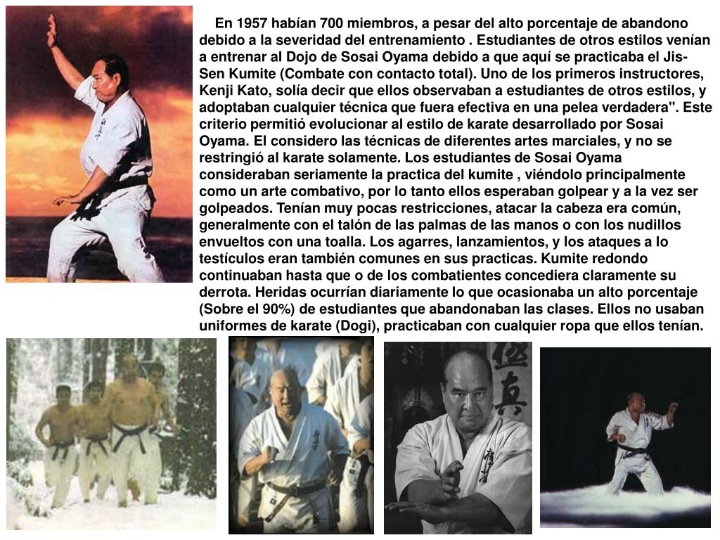 En 1957 habían 700 miembros, a pesar del alto porcentaje de abandono debido a la severidad del entrenamiento . Estudiantes de otros estilos venían a entrenar al Dojo de Sosai Oyama debido a que aquí se practicaba el Jis-Sen Kumite (Combate con contacto total). Uno de los primeros instructores, Kenji Kato, solía decir que ellos observaban a estudiantes de otros estilos, y adoptaban cualquier técnica que fuera efectiva en una pelea verdadera". Este criterio permitió evolucionar al estilo de karate desarrollado por Sosai Oyama. El considero las técnicas de diferentes artes marciales, y no se restringió al karate solamente. Los estudiantes de Sosai Oyama consideraban seriamente la practica del kumite , viéndolo principalmente como un arte combativo, por lo tanto ellos esperaban golpear y a la vez ser golpeados. Tenían muy pocas restricciones, atacar la cabeza era común, generalmente con el talón de las palmas de las manos o con los nudillos envueltos con una toalla. Los agarres, lanzamientos, y los ataques a lo testículos eran también comunes en sus practicas. Kumite redondo continuaban hasta que o de los combatientes concediera claramente su derrota. Heridas ocurrían diariamente lo que ocasionaba un alto porcentaje (Sobre el 90%) de estudiantes que abandonaban las clases. Ellos no usaban uniformes de karate (Dogi), practicaban con cualquier ropa que ellos tenían.