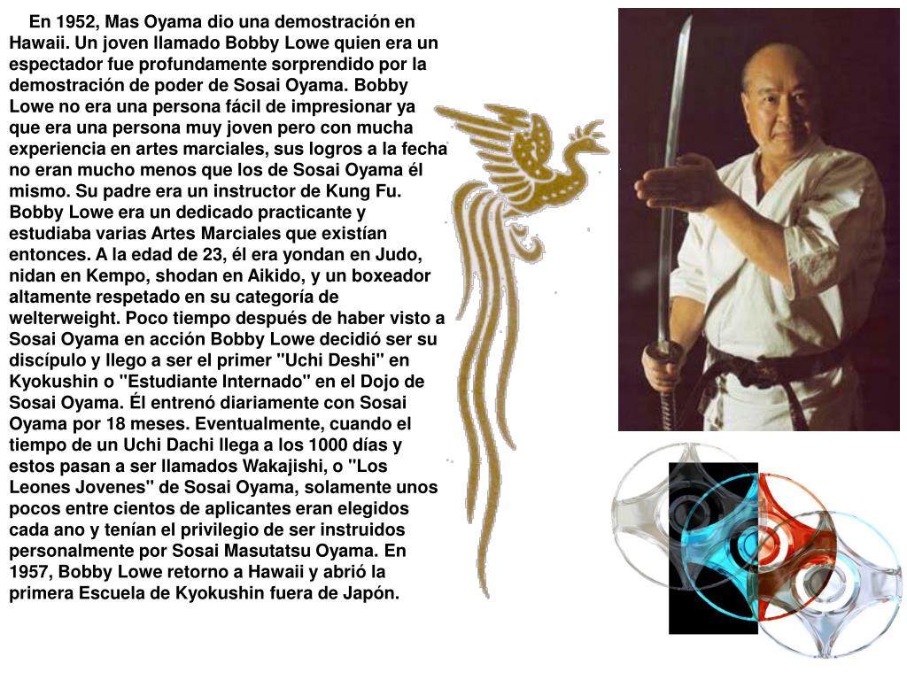 En 1952, Mas Oyama dio una demostración en Hawaii. Un joven llamado Bobby Lowe quien era un espectador fue profundamente sorprendido por la demostración de poder de Sosai Oyama. Bobby Lowe no era una persona fácil de impresionar ya que era una persona muy joven pero con mucha experiencia en artes marciales, sus logros a la fecha no eran mucho menos que los de Sosai Oyama él mismo. Su padre era un instructor de Kung Fu. Bobby Lowe era un dedicado practicante y estudiaba varias Artes Marciales que existían entonces. A la edad de 23, él era yondan en Judo, nidan en Kempo, shodan en Aikido, y un boxeador altamente respetado en su categoría de welterweight. Poco tiempo después de haber visto a Sosai Oyama en acción Bobby Lowe decidió ser su discípulo y llego a ser el primer "Uchi Deshi" en Kyokushin o "Estudiante Internado" en el Dojo de Sosai Oyama. Él entrenó diariamente con Sosai Oyama por 18 meses. Eventualmente, cuando el tiempo de un Uchi Dachi llega a los 1000 días y estos pasan a ser llamados Wakajishi, o "Los Leones Jovenes" de Sosai Oyama, solamente unos pocos entre cientos de aplicantes eran elegidos cada ano y tenían el privilegio de ser instruidos personalmente por Sosai Masutatsu Oyama. En 1957, Bobby Lowe retorno a Hawaii y abrió la primera Escuela de Kyokushin fuera de Japón.