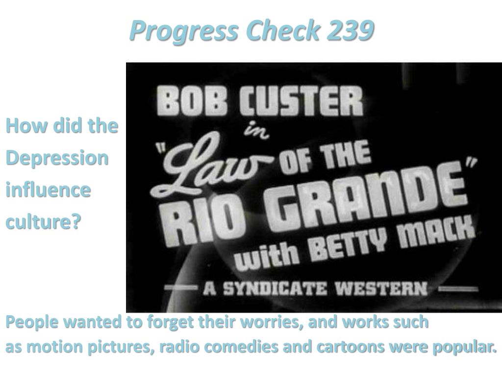 How did the Depression influence culture? Progress Check 239 People wanted to forget their worries, and works such as motion pictures, radio comedies and cartoons were popular.