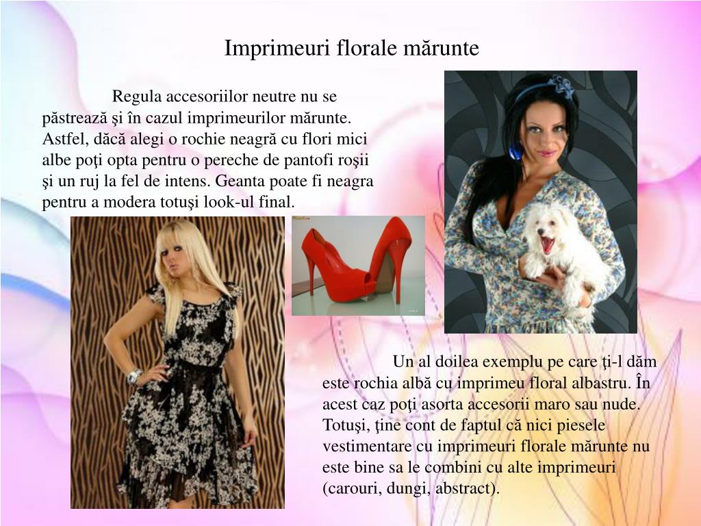 Imprimeuriflorale mărunte Regulaaccesoriilorneutre nu se păstreazăşiîn cazulimprimeurilor mărunte. Astfel, dăcăalegi o rochieneagră cu florimicialbepoţioptapentru o pereche de pantofiroşii şi un ruj la fel de intens. Geantapoatefineagrapentru a moderatotuşi look-ul final. Un al doileaexemplupe care ţi-l dăm esterochia albă cu imprimeu floral albastru. În acestcazpoţiasortaaccesoriimarosau nude. Totuşi, ţine cont de faptul cănicipieselevestimentare cu imprimeuriflorale mărunte nu estebinesa le combini cu alteimprimeuri (carouri, dungi, abstract).