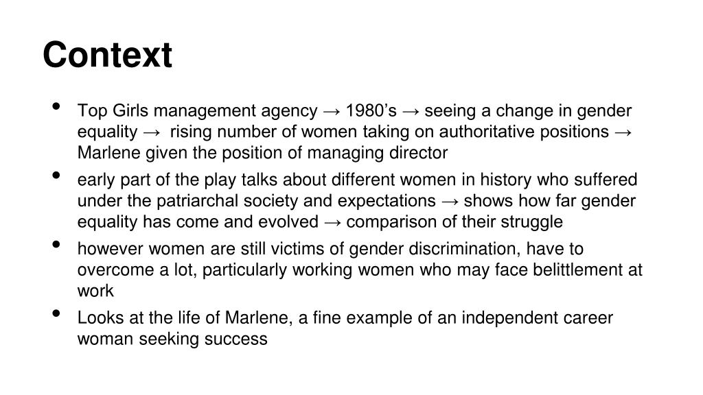 Context • Top Girls management agency → 1980’s → seeing a change in gender equality → rising number of women taking on authoritative positions → Marlene given the position of managing director • early part of the play talks about different women in history who suffered under the patriarchal society and expectations → shows how far gender equality has come and evolved → comparison of their struggle • however women are still victims of gender discrimination, have to overcome a lot, particularly working women who may face belittlement at work • Looks at the life of Marlene, a fine example of an independent career woman seeking success