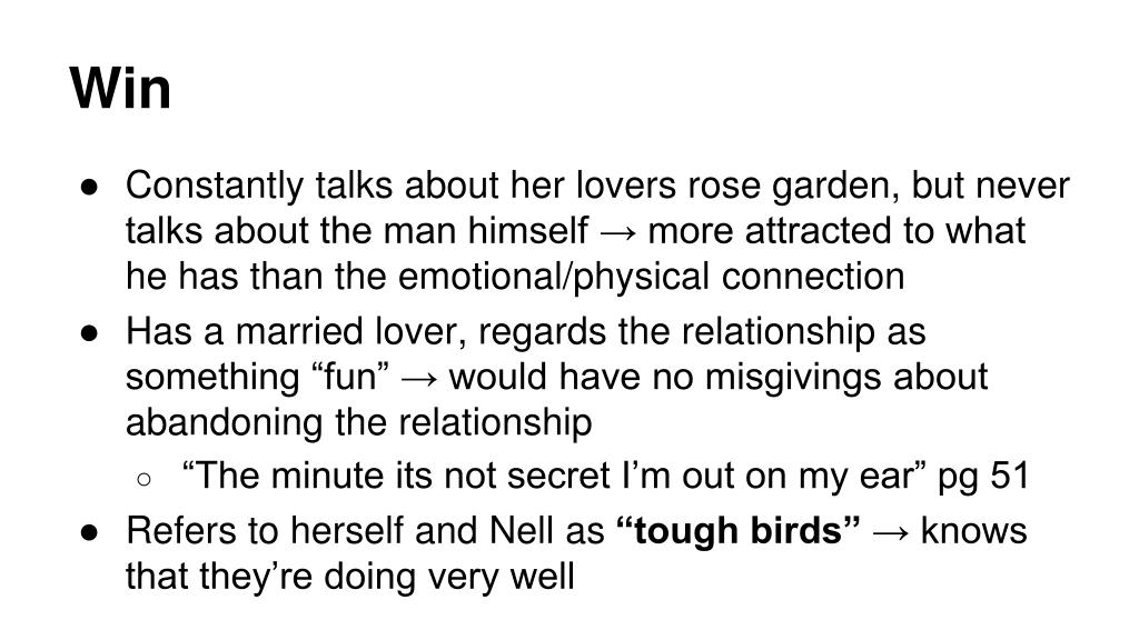 Win • Constantly talks about her lovers rose garden, but never talks about the man himself → more attracted to what he has than the emotional/physical connection • Has a married lover, regards the relationship as something “fun” → would have no misgivings about abandoning the relationship • “The minute its not secret I’m out on my ear” pg 51 • Refers to herself and Nell as “tough birds” → knows that they’re doing very well