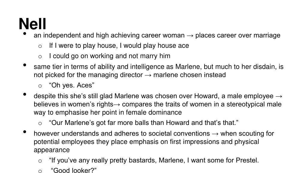 Nell • an independent and high achieving career woman → places career over marriage • If I were to play house, I would play house ace • I could go on working and not marry him • same tier in terms of ability and intelligence as Marlene, but much to her disdain, is not picked for the managing director → marlene chosen instead • “Oh yes. Aces” • despite this she’s still glad Marlene was chosen over Howard, a male employee → believes in women’s rights→ compares the traits of women in a stereotypical male way to emphasise her point in female dominance • “Our Marlene’s got far more balls than Howard and that’s that.” • however understands and adheres to societal conventions → when scouting for potential employees they place emphasis on first impressions and physical appearance • “If you’ve any really pretty bastards, Marlene, I want some for Prestel. • “Good looker?”