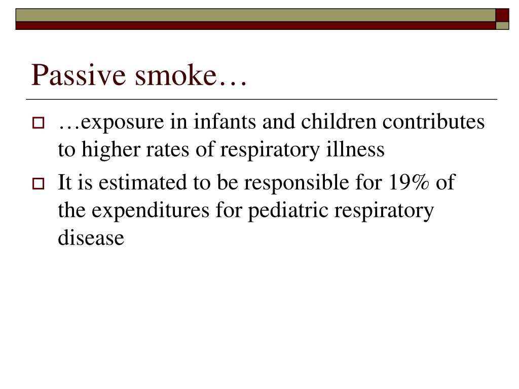 Passive smoke… • …exposure in infants and children contributes to higher rates of respiratory illness • It is estimated to be responsible for 19% of the expenditures for pediatric respiratory disease
