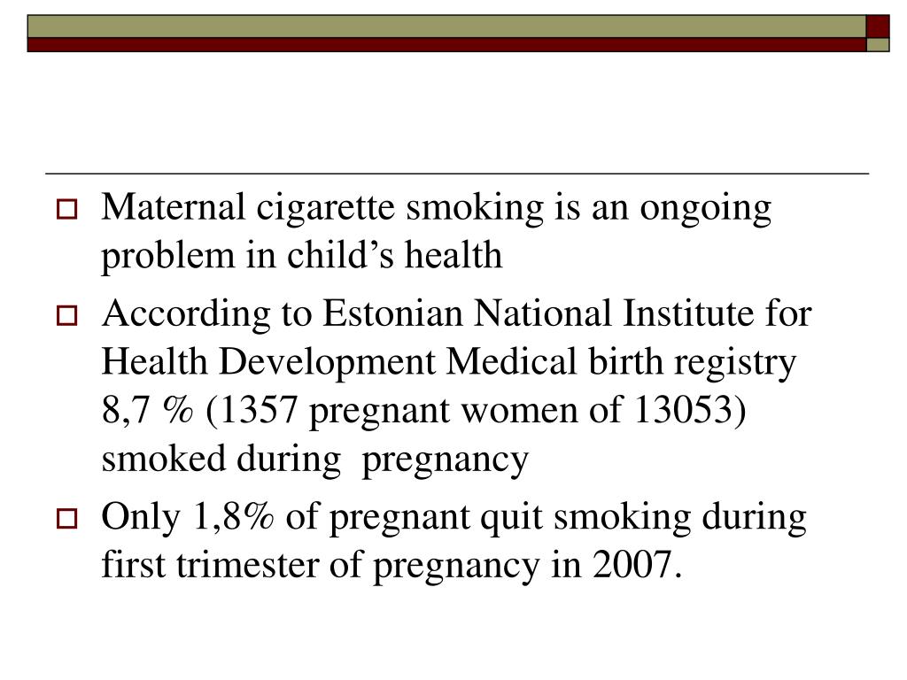 Maternal cigarette smoking is anongoing problem in child’s health • According to Estonian National Institute for Health Development Medical birth registry 8,7 % (1357 pregnant women of 13053) smoked during pregnancy • Only 1,8% of pregnant quit smoking during first trimester of pregnancy in 2007.