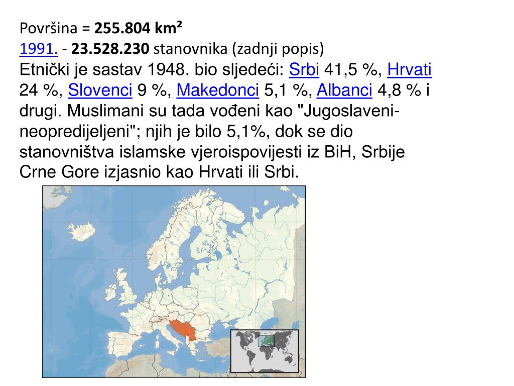 ZEMLJE BIVŠE JUGOSLAVIJE. SOCIJALISTIČKA REPUBLIKA BOSNA I HERCEGOVINA. SOCIJALISTIČKA REPUBLIKA SRBIJA. SOCIJALISTIČKA REPUBLIKA MAKEDONIJA. SOCIJALISTIČKA REPUBLIKA CRNA GORA. SOCIJALISTIČKA REPUBLIKA SLOVENIJA. SOCIJALISTIČKA REPUBLIKA HRVATSKA. Površina = 255.804 km²