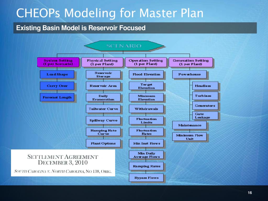 CHEOPs Modeling for Master Plan - Enhancements Conformance with SL 2010-143 and NC-DENR Requirements • Update to provide tools for individual user database – support server access • Base model update to include existing known tributary w/r Nodes > 100,000-gpd • Base model update to include tributary identified ecological flow points • User tools to add Nodes, allocate inflow and w/r connectivity • Update DSS support • Update reporting to daily time step to reduce output file size