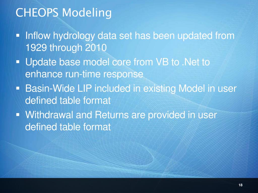 CHEOPS Modeling • Inflow hydrology data set has been updated from 1929 through 2010 • Update base model core from VB to .Net to enhance run-time response • Basin-Wide LIP included in existing Model in user defined table format • Withdrawal and Returns are provided in user defined table format