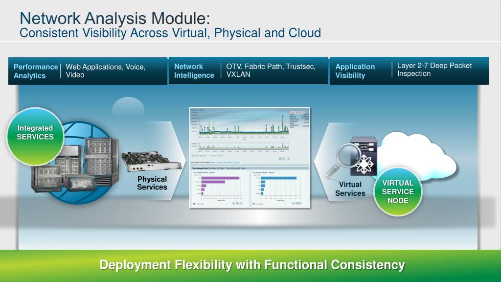 Network Analysis Module: Consistent Visibility Across Virtual, Physical and Cloud PerformanceAnalytics NetworkIntelligence ApplicationVisibility Web Applications, Voice, Video OTV, Fabric Path, Trustsec, VXLAN Layer 2-7 Deep Packet Inspection IntegratedSERVICES VIRTUALSERVICE NODE Physical Services Virtual Services Deployment Flexibility with Functional Consistency