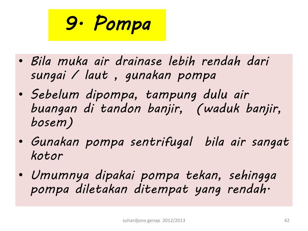 9. Pompa • Bilamuka air drainaselebihrendahdarisungai / laut , gunakanpompa • Sebelumdipompa, tampungdulu air buanganditandonbanjir, (wadukbanjir, bosem) • Gunakanpompasentrifugalbila air sangatkotor • Umumnyadipakaipompatekan, sehinggapompadiletakanditempat yang rendah. suhardjono genap 2012/2013