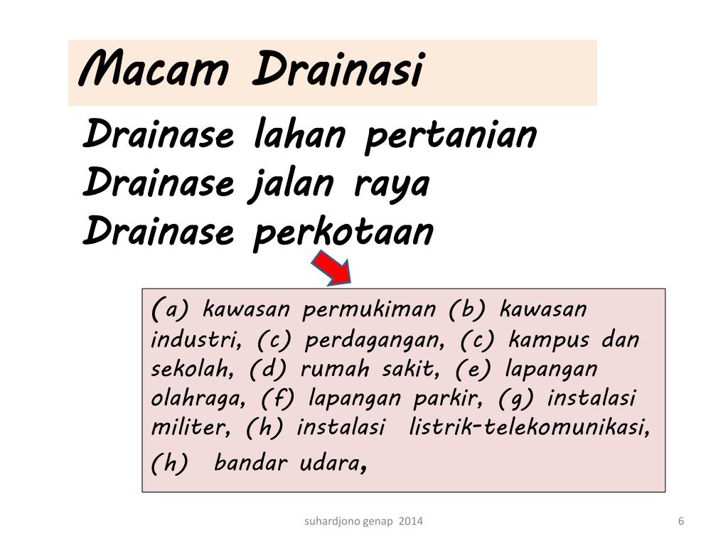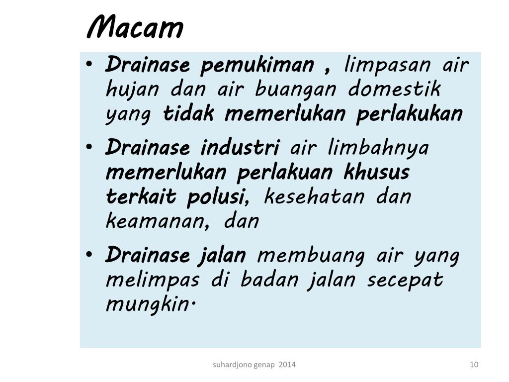 Macam • Drainase pemukiman , limpasan air hujan dan air buangan domestik yang tidak memerlukan perlakukan • Drainase industri air limbahnya memerlukan perlakuan khusus terkait polusi, kesehatan dan keamanan, dan • Drainase jalan membuang air yang melimpas di badan jalan secepat mungkin. suhardjono genap 2014