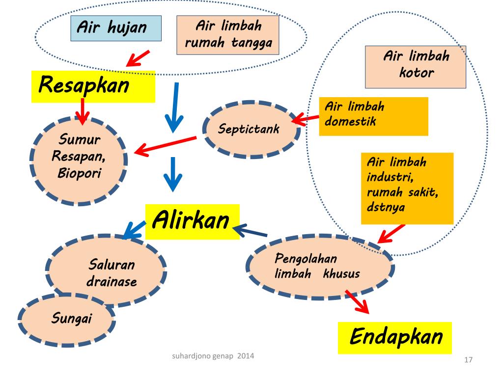 Air hujan Air limbahrumahtangga Air limbahkotor Resapkan Air limbahdomestik Septictank SumurResapan, Biopori Air limbahindustri, rumahsakit, dstnya Alirkan Pengolahanlimbahkhusus Salurandrainase Sungai Endapkan suhardjonogenap 2014