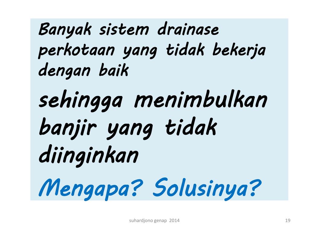 Banyak sistem drainase perkotaan yang tidak bekerja dengan baik sehingga menimbulkan banjiryang tidak diinginkan Mengapa? Solusinya? suhardjono genap 2014
