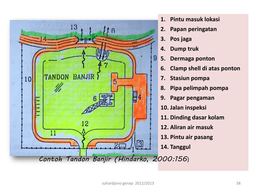 Pintumasuklokasi Papanperingatan Pos jaga Dump truk Dermagaponton Clamp shell diatasponton Stasiunpompa Pipapelimpahpompa Pagarpengaman Jalaninspeksi Dindingdasarkolam Aliran air masuk Pintu air pasang Tanggul ContohTandonBanjir (Hindarko, 2000:156) suhardjono genap 2012/2013