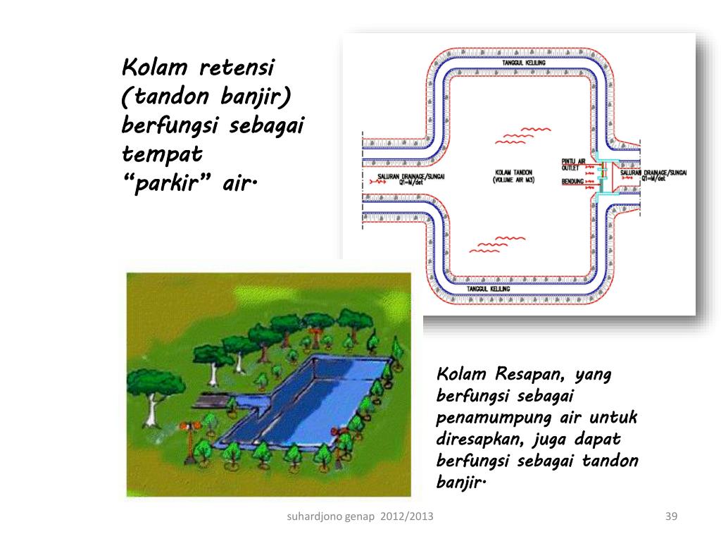 Kolamretensi (tandonbanjir) berfungsisebagaitempat “parkir” air. KolamResapan, yang berfungsisebagaipenamumpung air untukdiresapkan, jugadapatberfungsisebagaitandonbanjir. suhardjono genap 2012/2013