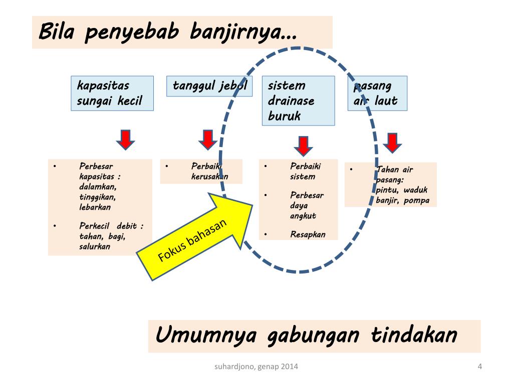 Bilapenyebabbanjirnya… kapasitassungaikecil tangguljebol sistemdrainaseburuk pasang air laut • Perbesarkapasitas : dalamkan, tinggikan, lebarkan • Perkecil debit : tahan, bagi, salurkan • Perbaikikerusakan • Perbaikisistem • Perbesardayaangkut • Resapkan • Tahan air pasang: pintu, wadukbanjir, pompa Fokusbahasan Umumnyagabungantindakan suhardjono, genap 2014