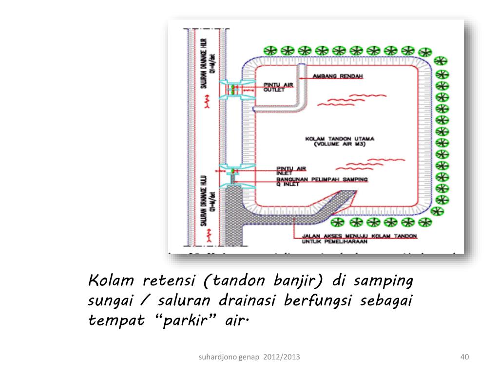 Kolamretensi (tandonbanjir) disampingsungai / salurandrainasiberfungsisebagaitempat “parkir” air. suhardjono genap 2012/2013