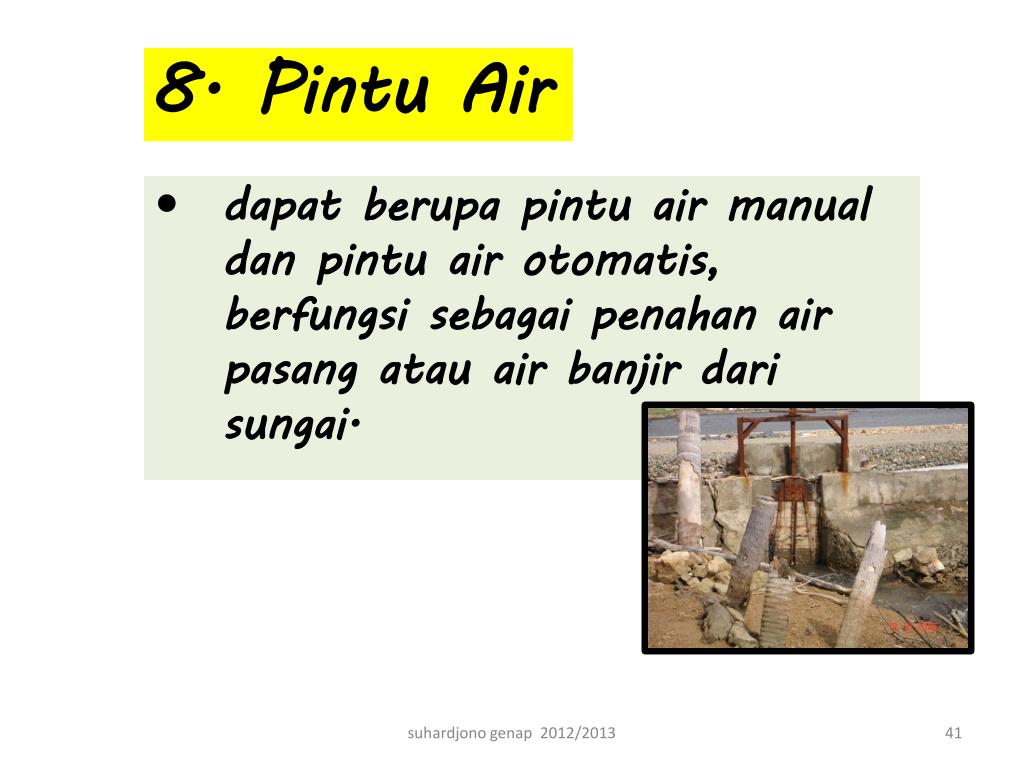 8. Pintu Air • dapat berupa pintu air manual dan pintu air otomatis, berfungsi sebagai penahan air pasang atau air banjir dari sungai. suhardjono genap 2012/2013