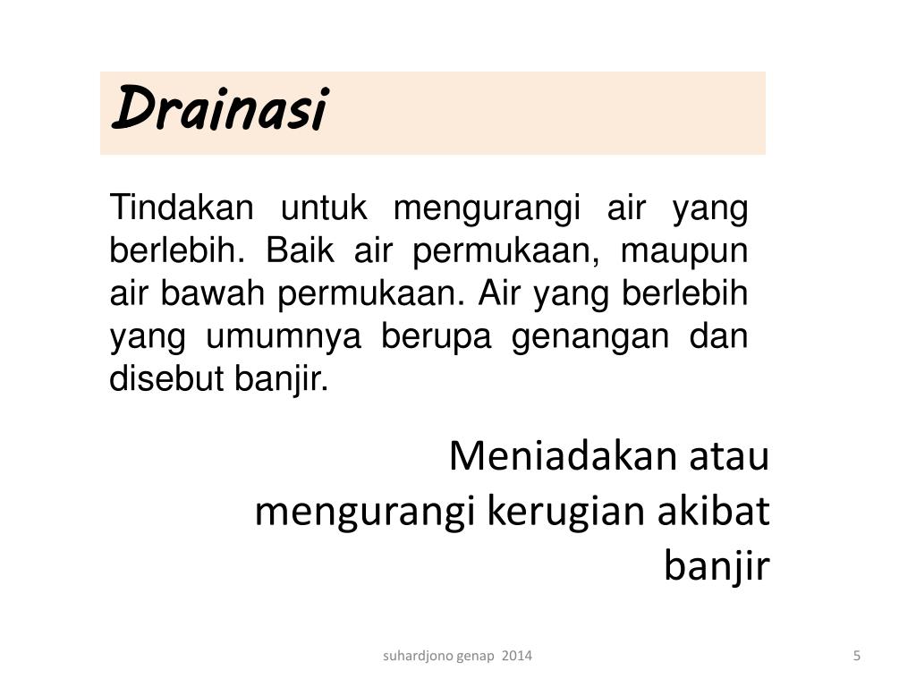 Drainasi Tindakan untuk mengurangi air yang berlebih. Baik air permukaan, maupun air bawah permukaan. Air yang berlebih yang umumnya berupa genangan dan disebut banjir. Meniadakanataumengurangikerugianakibatbanjir suhardjono genap 2014