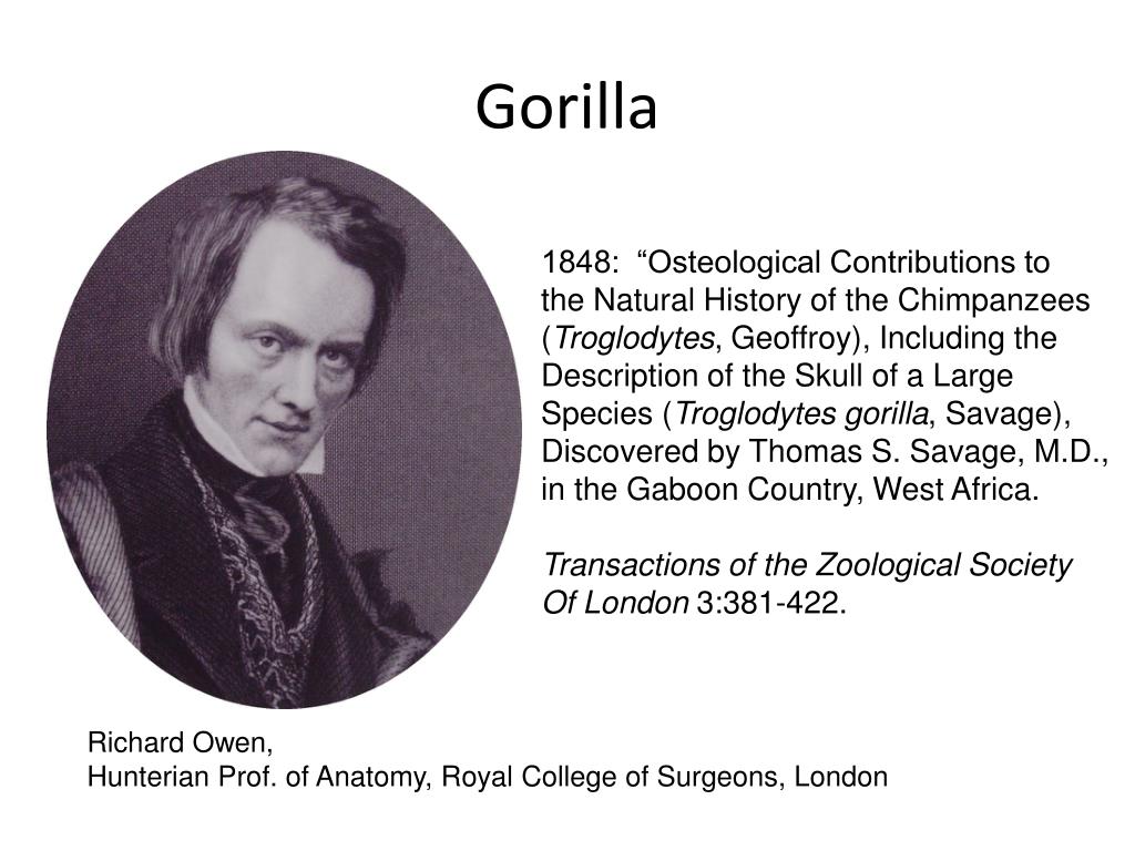 Gorilla 1848: “Osteological Contributions to the Natural History of the Chimpanzees (Troglodytes, Geoffroy), Including the Description of the Skull of a Large Species (Troglodytes gorilla, Savage), Discovered by Thomas S. Savage, M.D., in the Gaboon Country, West Africa. Transactions of the Zoological Society Of London 3:381-422. Richard Owen, Hunterian Prof. of Anatomy, Royal College of Surgeons, London