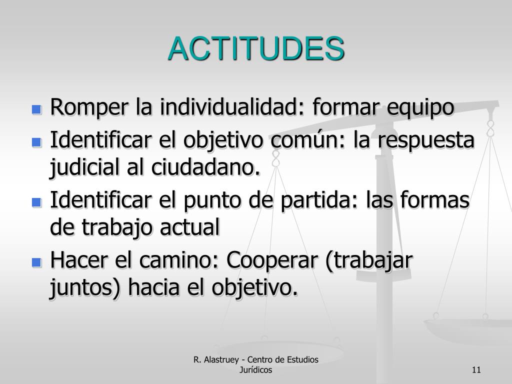 ACTITUDES • Romper la individualidad: formar equipo • Identificar el objetivo común: la respuesta judicial al ciudadano. • Identificar el punto de partida: las formas de trabajo actual • Hacer el camino: Cooperar (trabajar juntos) hacia el objetivo. R. Alastruey - Centro de Estudios Jurídicos