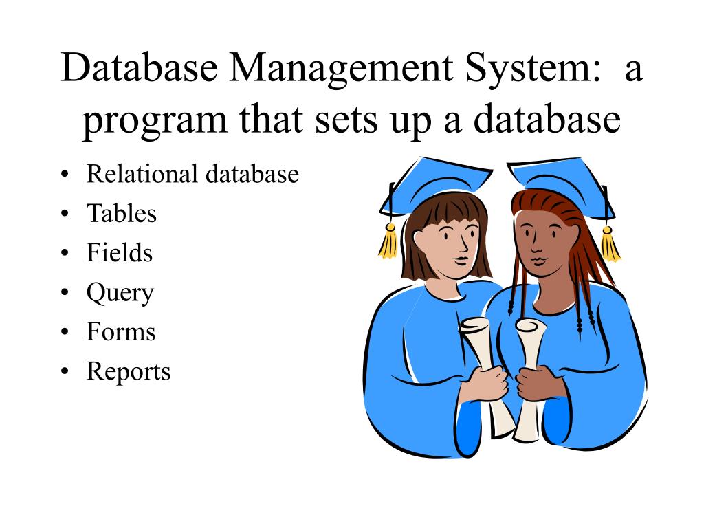 Relational database Tables Fields Query Forms Reports Database Management System: a program that sets up a database