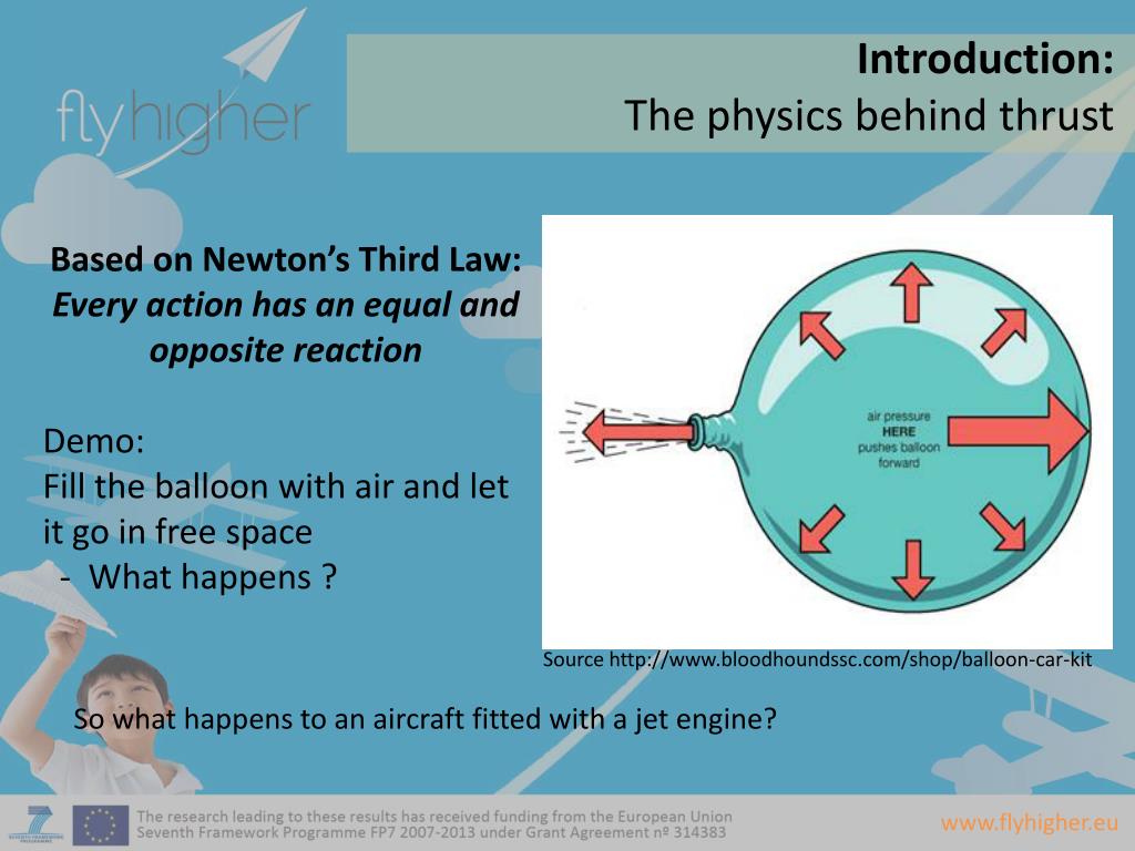 Introduction: • The physics behind thrust Based on Newton’s Third Law: Every action has an equal and opposite reaction Demo: Fill the balloon with air and let it go in free space - What happens ? Source http://www.bloodhoundssc.com/shop/balloon-car-kit So what happens to an aircraft fitted with a jet engine?