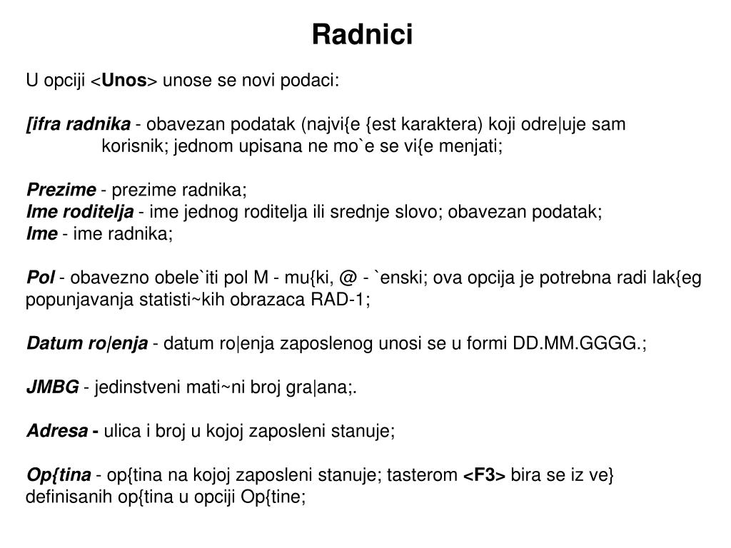 Radnici U opciji <Unos> unose se novi podaci: [ifra radnika - obavezan podatak (najvi{e {est karaktera) koji odre|uje sam korisnik; jednom upisana ne mo`e se vi{e menjati; Prezime - prezime radnika; Ime roditelja - ime jednog roditelja ili srednje slovo; obavezan podatak; Ime - ime radnika; Pol- obavezno obele`iti pol M - mu{ki, @ - `enski; ova opcija je potrebna radi lak{eg popunjavanja statisti~kih obrazaca RAD-1; Datum ro|enja - datum ro|enja zaposlenog unosi se u formi DD.MM.GGGG.; JMBG- jedinstveni mati~ni broj gra|ana;. Adresa - ulica i broj u kojoj zaposleni stanuje; Op{tina - op{tina na kojoj zaposleni stanuje; tasterom <F3> bira se iz ve} definisanih op{tina u opciji Op{tine;