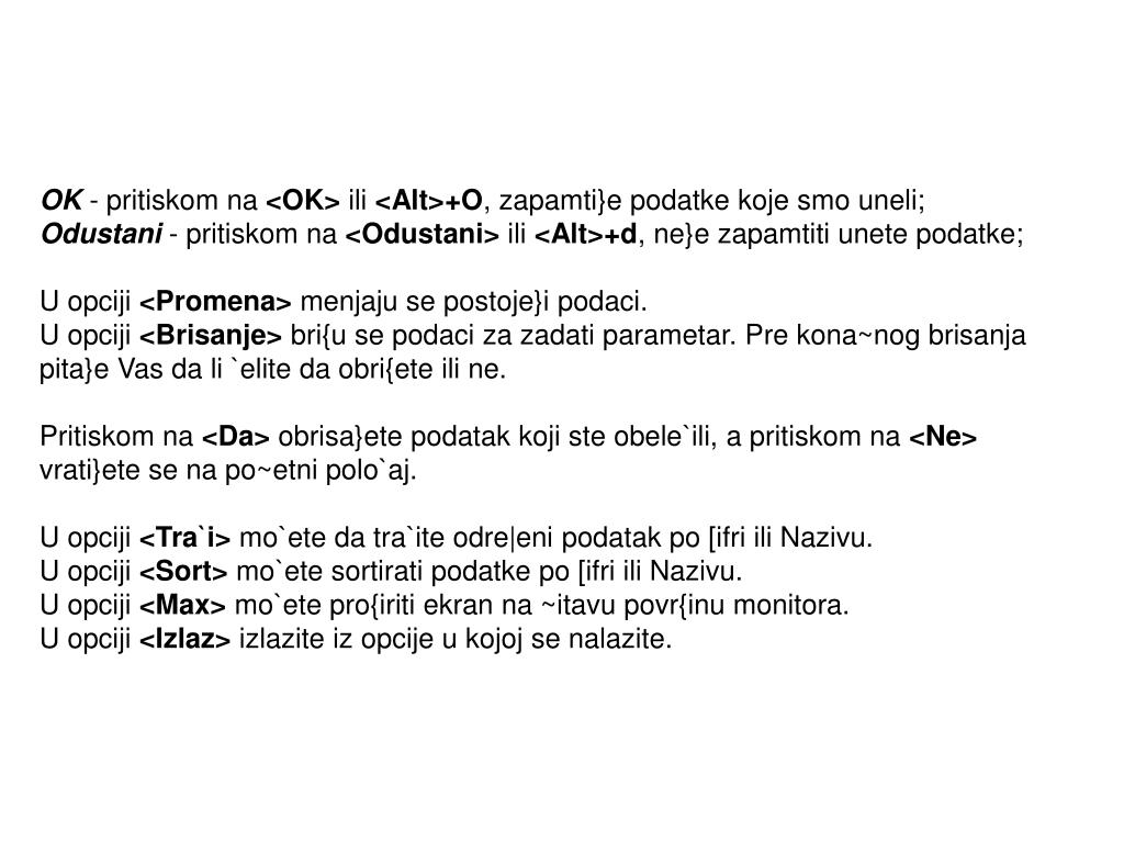 OK - pritiskom na <OK> ili <Alt>+O, zapamti}e podatke koje smo uneli; Odustani - pritiskom na <Odustani> ili <Alt>+d, ne}e zapamtiti unete podatke. U opciji <Promena> menjaju se postoje}i podaci. U opciji <Brisanje> bri{u se podaci za zadati parametar. Pre kona~nog brisanja pita}e Vas da li `elite da obri{ete ili ne. Pritiskom na <Da> obrisa}ete podatak koji ste obele`ili, a pritiskom na <Ne> vrati}ete se na po~etni polo`aj. U opciji <Tra`i> mo`ete da tra`ite odre|eni podatak po [ifri ili Nazivu. U opciji <Sort> mo`ete sortirati podatke po [ifri ili Nazivu. U opciji <Max> mo`ete pro{iriti ekran na ~itavu povr{inu monitora. U opciji <Izlaz> izlazite iz opcije u kojoj se nalazite.